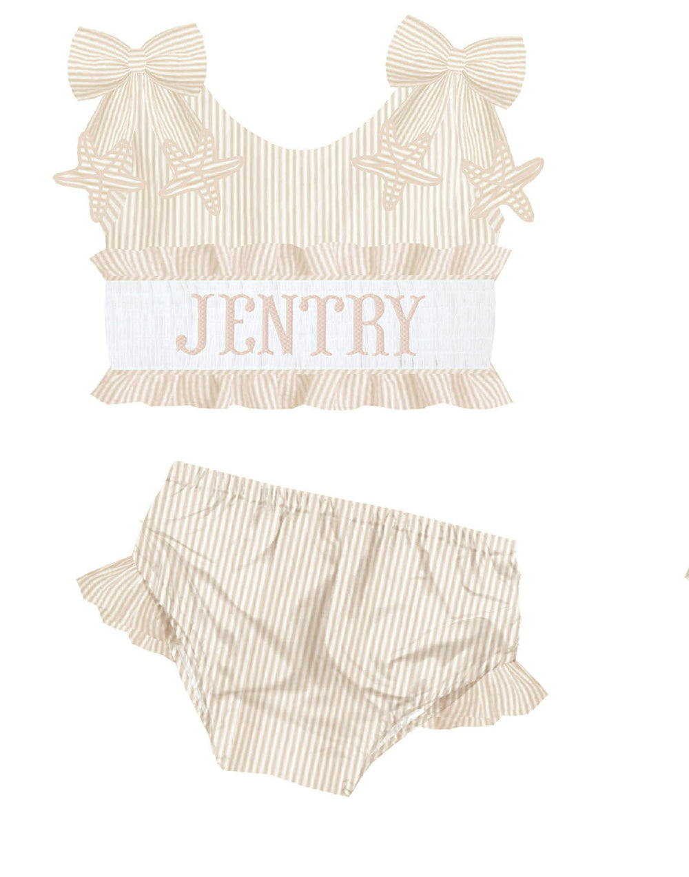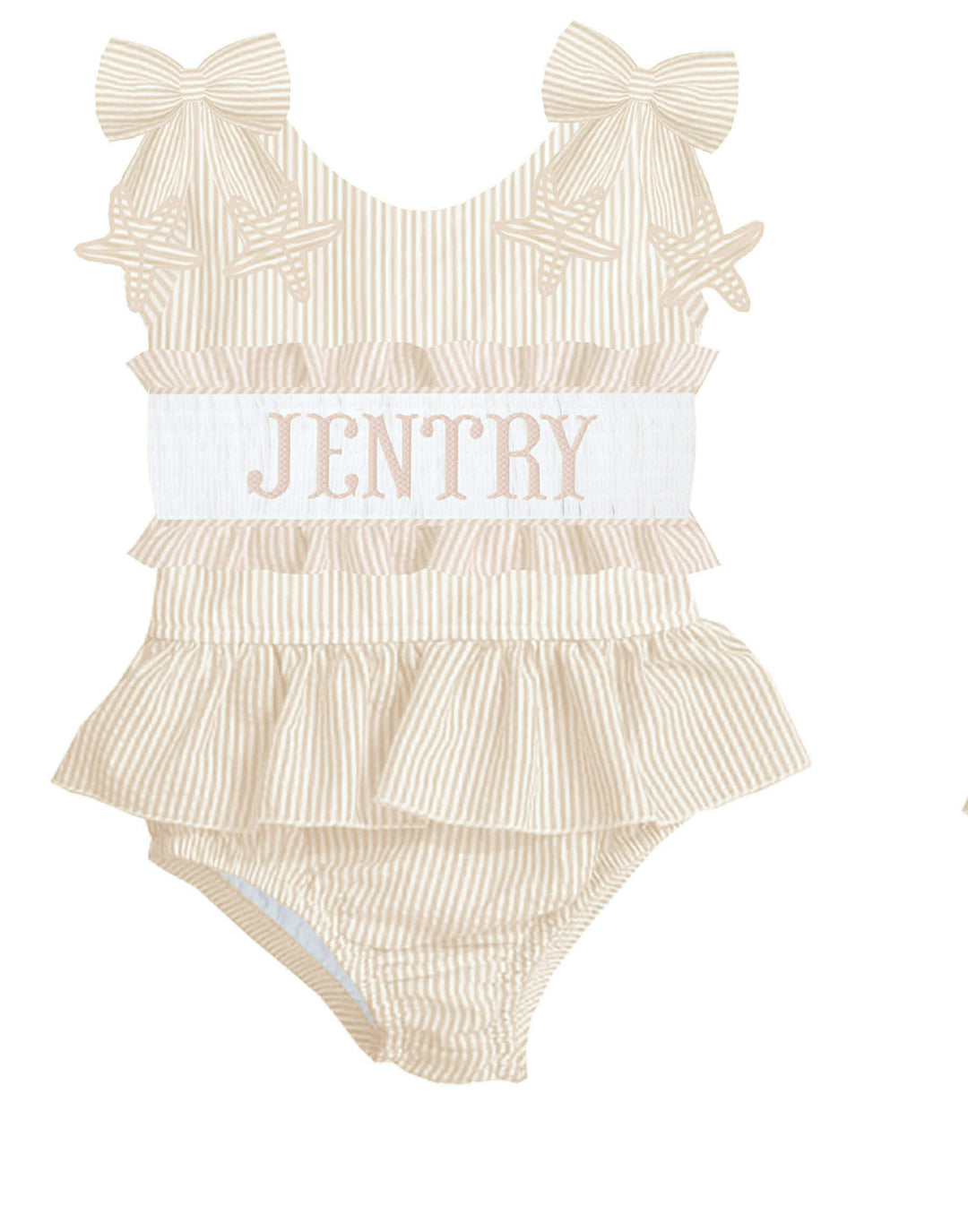 HAND SMOCKED TAN STARFISH SEERSUCKER SWIM PO
