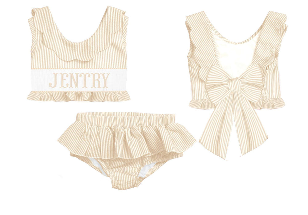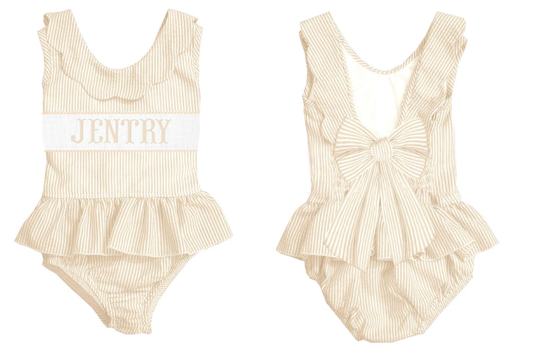 HAND SMOCKED TAN SEERSUCKER SWIM PO