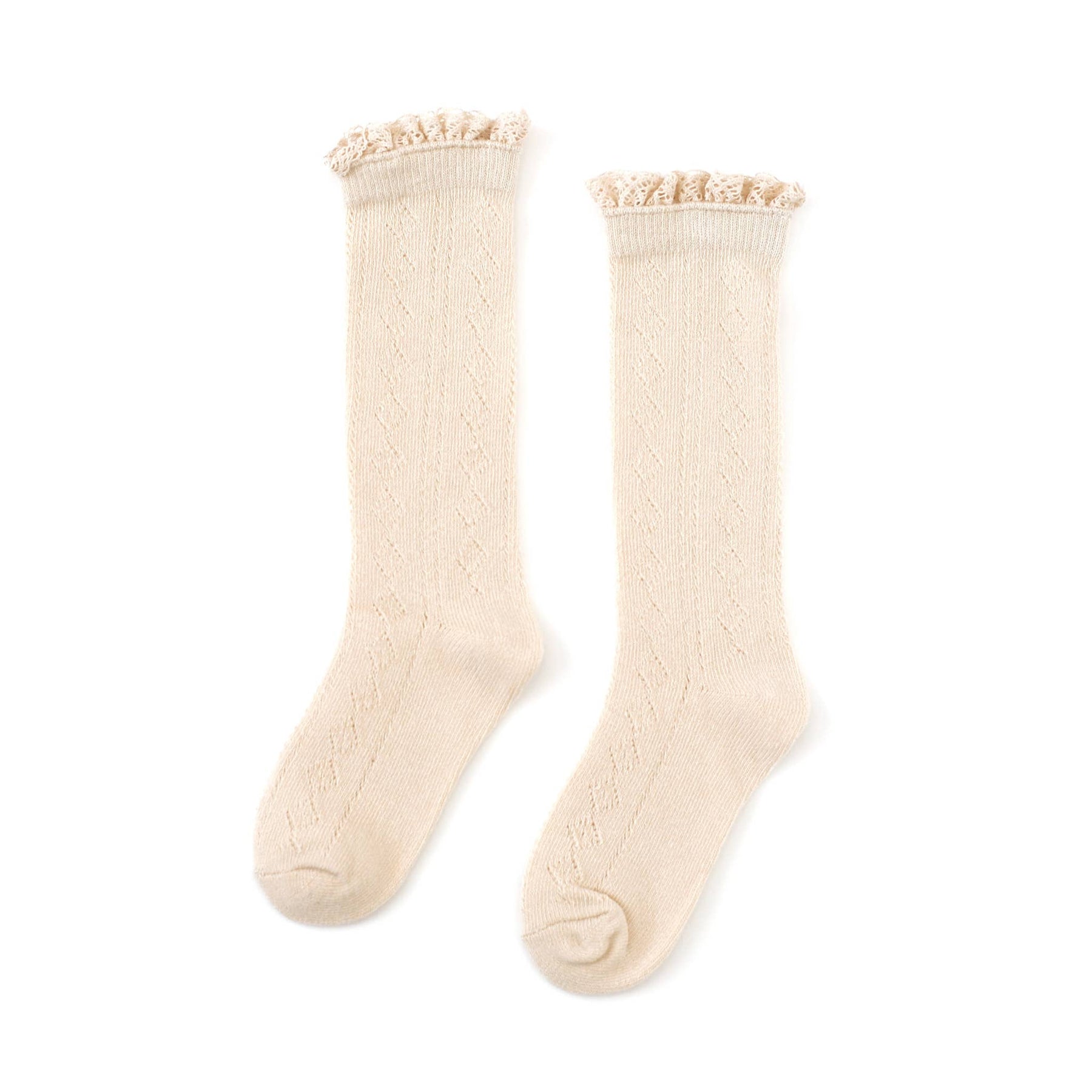 Little Stocking Co. Vanilla Fancy Lace Top Knee Highs for babies, toddlers and girls! Our customer favorite fancy mesh is back and available in an all new style. Machine wash cold with like colors. Tumble dry low or lay flat to dry.